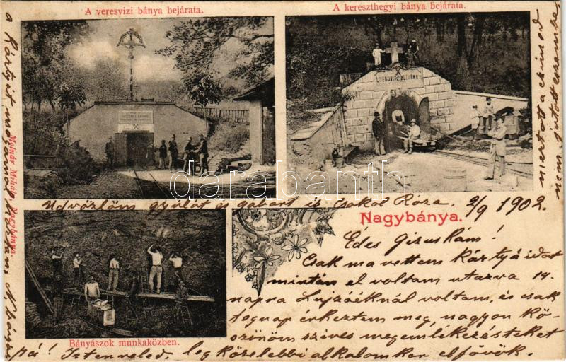 1902 Nagybánya, Baia Mare; A veresvizi aranybánya bejárata, a kereszthegyi bánya bejárata, Lobkovitz altárna, bányában dolgozó munkások, létra, csille. Molnár Mihály kiadása / Mina de aur Valei rosie / gold mine entrance, adit, miners working in the mine, ladder, mine cart. Floral