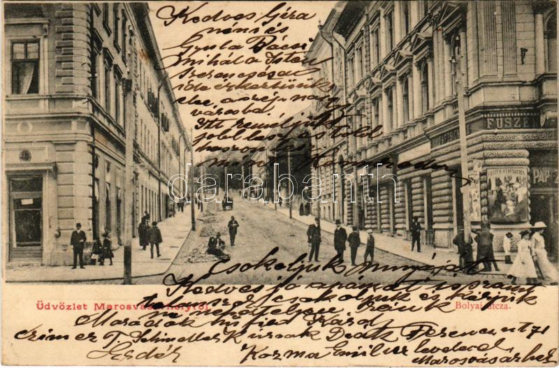 Leírás: 1904 Marosvásárhely, Targu Mures; Bolyai utca, Pap Zsigmond üzlete / street view, shops