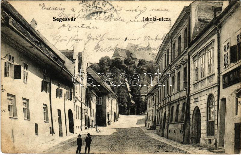 Leírás: 1906 Segesvár, Schässburg, Sighisoara; Iskola utca, Emil Radler üzlete. Zeidner H. kiadása / street view, shop (EK)