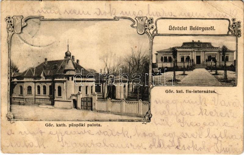1910 Belényes, Beius; Görögkatolikus püspöki palota és görögkeleti fiúinternátus. Wagner Vilmos fényképész / Greek Catholic bishop's palace and Orthodox boys' boarding school. Art Nouveau, floral (fa)