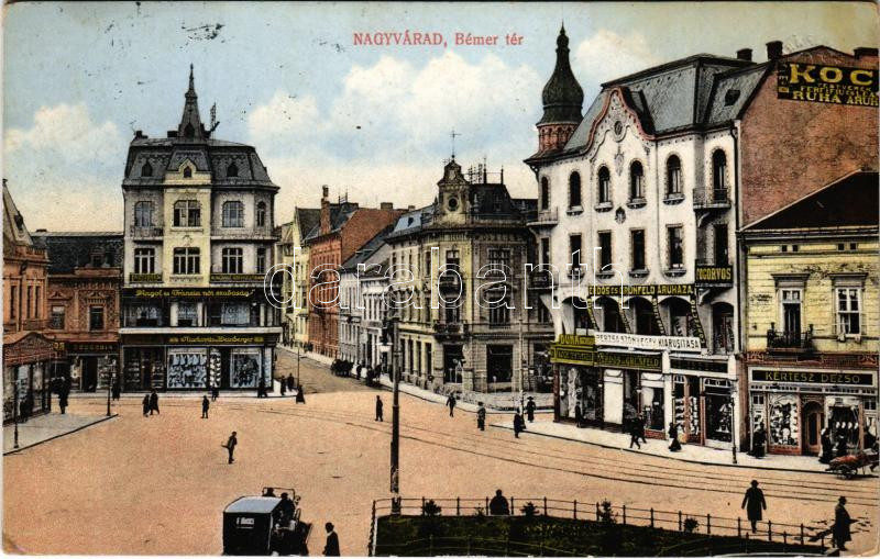 1914 Nagyvárad, Oradea; Bémer tér, Koch Testvérek férfi, fiú és leány ruha áruháza, Kertész Dezső, Erdős és Grünfeld áruháza, Markovits és Weinberger üzlete, fogorvos, perzsa szőnyegek kiárusítása, Angol és francia női szabóság, Biztosítási iroda, drogéria. Boros Jenő kiadása / square, shops, insurance company, dentist (EK)
