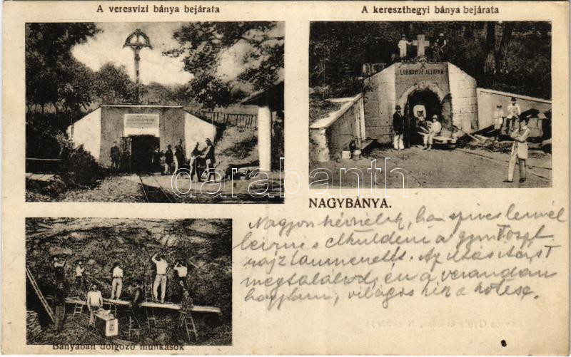 1916 Nagybánya, Baia Mare; A veresvizi aranybánya bejárata, a kereszthegyi bánya bejárata, Lobkovitz altárna, bányában dolgozó munkások, létra, csille. Kiadja Kovács Gyula / Mina de aur Valei rosie / gold mine entrance, adit, miners working in the mine, ladder, mine cart