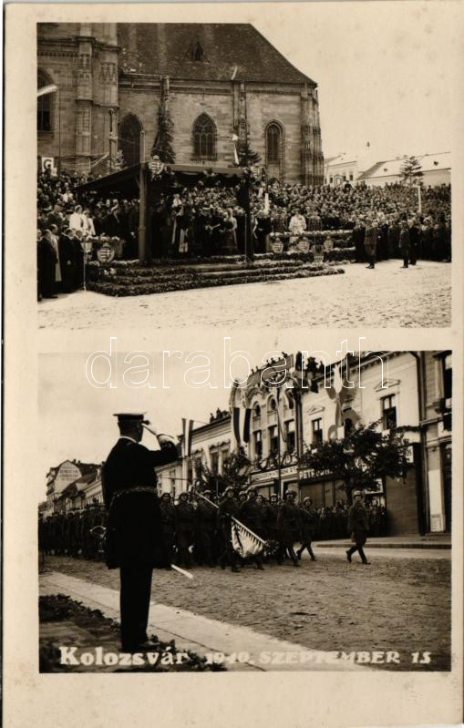 1940 Kolozsvár, Cluj; bevonulás szeptember 15-én, Horthy Miklós, Kereskedelmi és Hitelbank rt. / entry of the Hungarian troops, Horthy, bank. photo (non PC)
