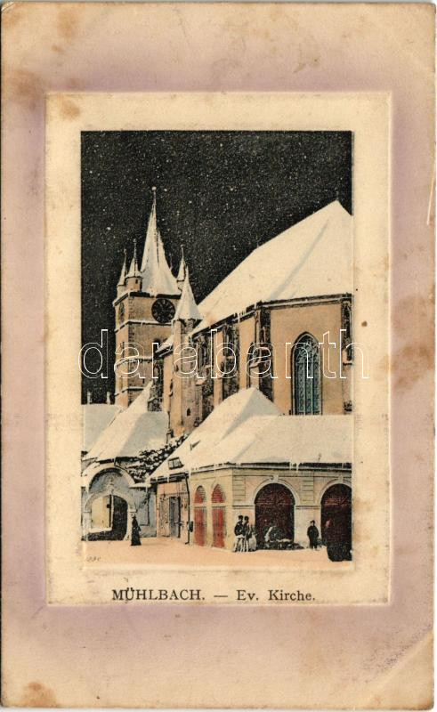 Szászsebes, Mühlbach, Sebesul Sasesc, Sebes; Evangélikus templom télen este, Josef Hientz üzlete és saját kiadása / Lutheran church at night in winter, publisher's shop (fl)