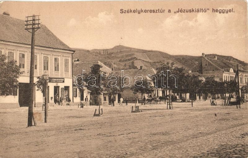 Székelykeresztúr, Cristuru Secuiesc; utcakép, Szabó Kálmán nyomdája, üzlete és saját kiadása, Jézuskiáltó hegy / street view, publisher's shop, mountain (EK)