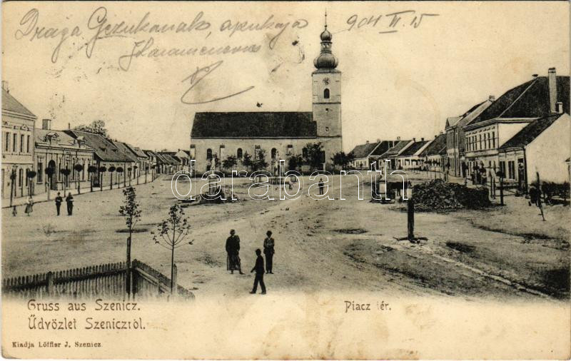 Leírás: 1904 Szenice, Szenicz, Senitz, Senica nad Myjavou; Piac tér, templom. Löffler J. kiadása / square, church (EK)
