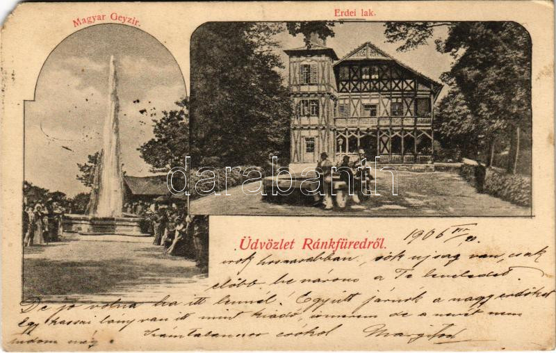 Leírás: 1906 Ránkfüred, Rank-Herlány, Ránkherlány, Rank Herlein, Herlany (Kassa, Kosice, Kaschau); A magyar gejzír, Erdei lak / Herliansky gejzír / geyser, fountain, villa (EM)
