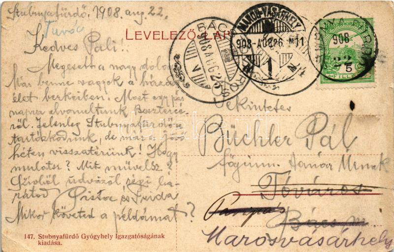 Leírás: 1908 Stubnyafürdő, Túróchévíz, Stubnianske Teplice, Turcianske Teplice; Természetes meleg kénforrások köszvény, csúz és hűdés ellen javalva. Hidegvízgyógyintézet. Légkúra a fenyvesekben. W.L. (?) 147. Stubnyafürdő Gyógyhely Igazgatóságának kiadása / spa, climatic health resort (kis szakadás / small tear)