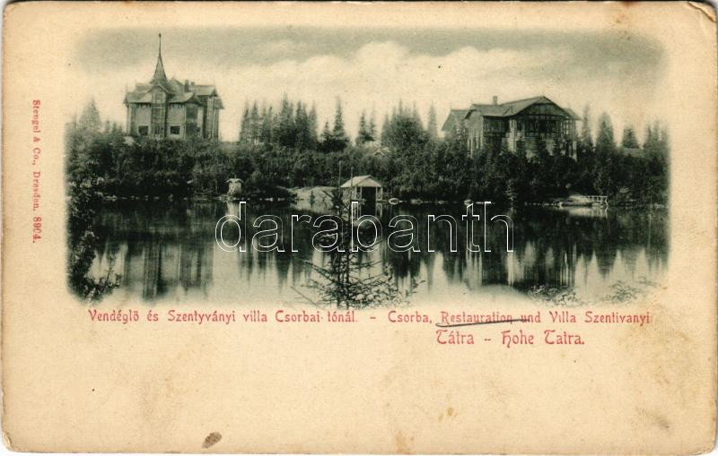 Tátra, Magas-Tátra, Vysoké Tatry; Vendéglő és Szentiványi villa a Csorba tónál / Restauration und Villa Szentiványi / Strbské pleso / restaurant, villa, lake (EK)