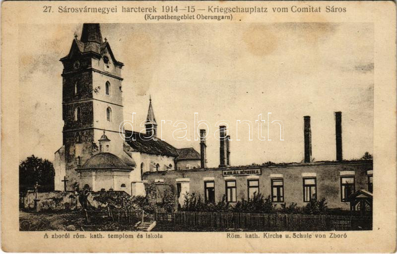 Zboró, Zborov; Római katolikus templom és iskola, romok. 27. Sárosvármegyei harcterek 1914-15. D.K.F.E. Friedmann József kiadása / Röm. kath. Kirche und Schule, Kriegschauplatz vom Comitat Sáros / WWI destroyed church and school, ruins (fl)