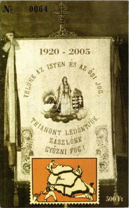 Leírás: 1920-2005 "Velünk az Isten és az ősi jog. Trianont ledöntjük, zászlónk győzni fog!" Irredenta propaganda - MODERN számozott emlékkártya (non PC)