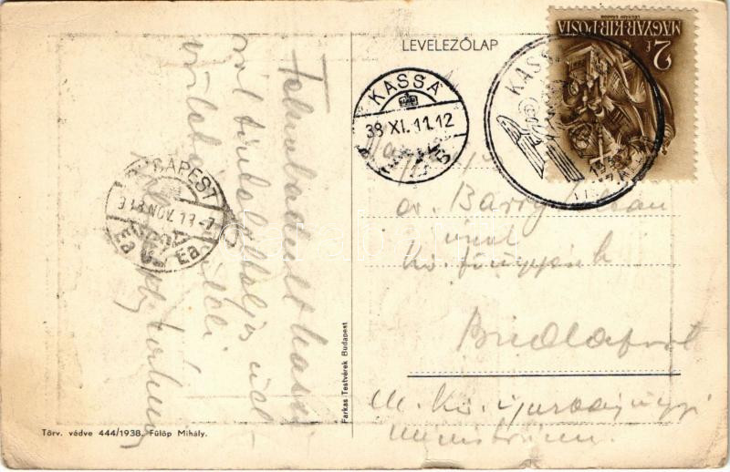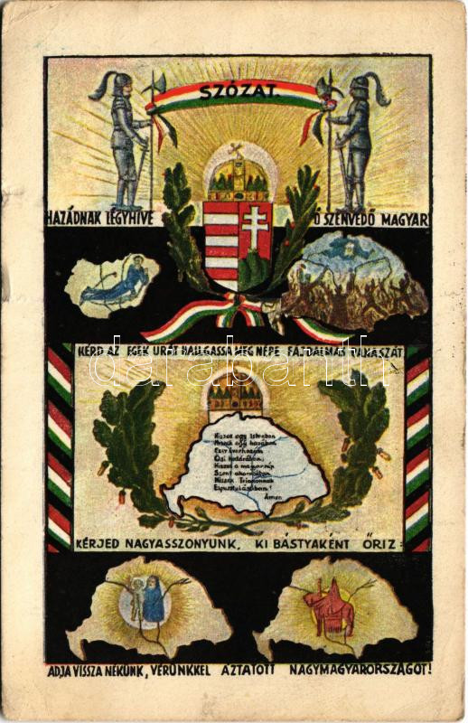 1938 Szózat. Hazádnak légy híve ó szenvedő magyar, kérd az egek urát hallgassa meg népe fájdalmas panaszát. Kérjed Nagyasszonyunk, kis bástyaként őriz: Adja vissza nekünk, vérünkkel áztatott Magyarországot! 444/1938 Fülöp Mihály, Farkas testvérek kiadása / Hungarian irredenta art + "1938 Kassa visszatért" So. Stpl (kis szakadások / small tears)