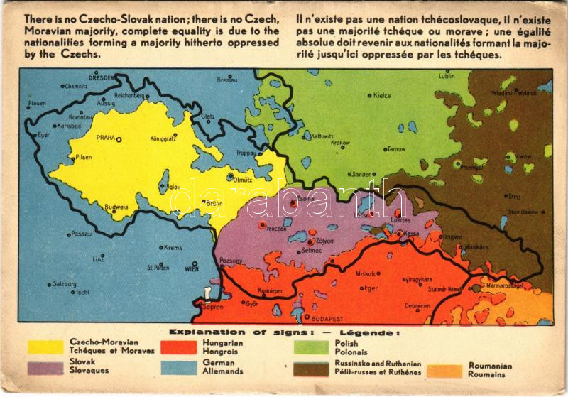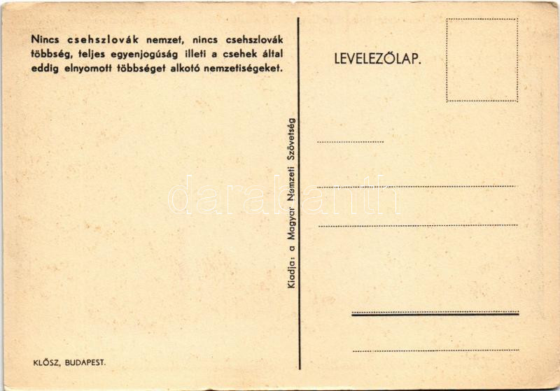 Nincs csehszlovák nemzet, nincs csehszlovák többség, teljes egyenjogúság illeti a csehek által eddig elnyomott többséget alkotó nemzetiségeket. A Magyar Nemzeti Szövetség kiadása / Hungarian Anti-Czechoslovak propaganda, irredenta map (EK)