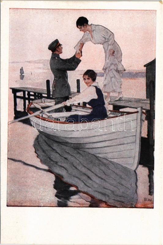 Leírás: Heimaturlaub. Kriegspostkarten von B. Wennerberg Nr. 12. / WWI German military art postcard, officer with ladies s: B.W.