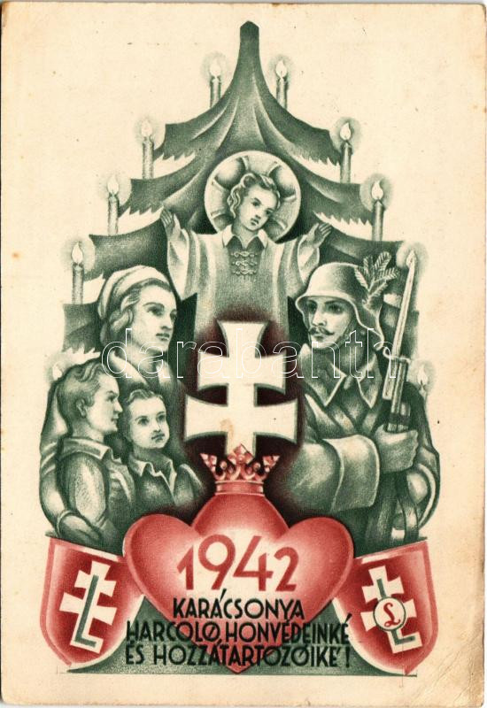 "Magyarország jövő békessége és felvirágzása - a szovjetoroszországi harmezőkön dől el!" 1942 Karácsonya Harcoló honvédeinké és hozzátartozóiké. Leventeifjúság honvédkarácsonya. Tábori Postai Levelezőlap / WWII Hungarian military field postcard with Christmas greeting s: Légrády S. (EB)