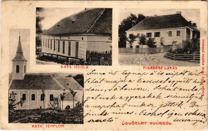 Leírás: 1903 Súr, Suúr; Katolikus templom és iskola, Főerdész lakás. Fülöp Antal esperes plébános kiadása (EK)