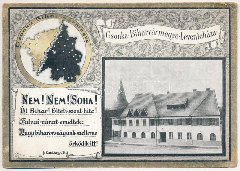 Leírás: 1928 Berettyóújfalu, Csonka-Bihar vármegye Levente háza és saját kiadása. Nem! Nem! Soha! (Nadányi Z.) Art Nouveau irredenta (EK)