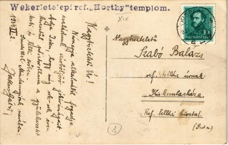 1934 Budapest XIX. Kispest, Wekerletelepi református Horthy templom. p... https://www.darabanth.com/hu/428-Gyorsarveres/428.0/Kepeslapok/Magyarorszag~1500003/1934-Budapest-XIX-Kispest-Wekerletelepi-reformatus-Horthy-templom-photo-EK~II2744168