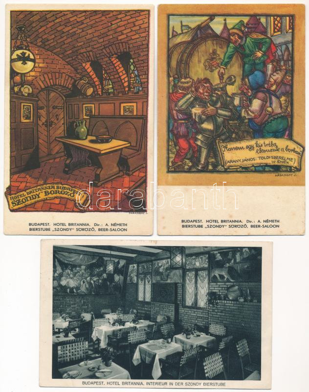 Leírás: Budapest VI. Hotel Britannia és Szondy söröző grafikai reklámlapja s: Haranghy J. - 3 db régi képeslap