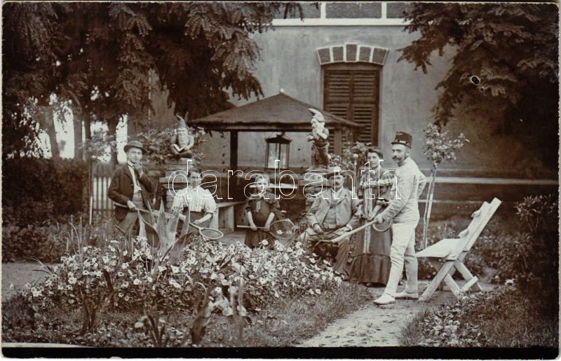 Leírás: Ismeretlen település, vasútállomás és a mögötte lévő park, kerti törpék, vasutas, teniszütős család. photo