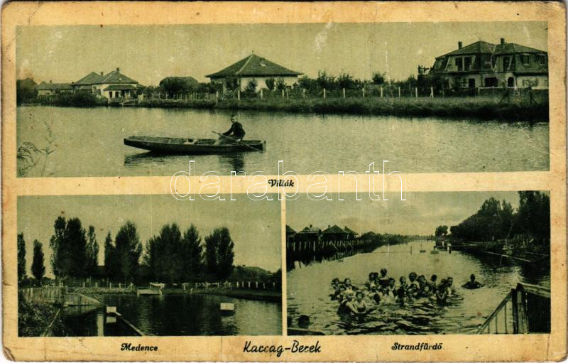 Leírás: Karcag, Bereki strand és gyógyfürdő, medence, fürdőzők, villák. Róna kiadása (fa)