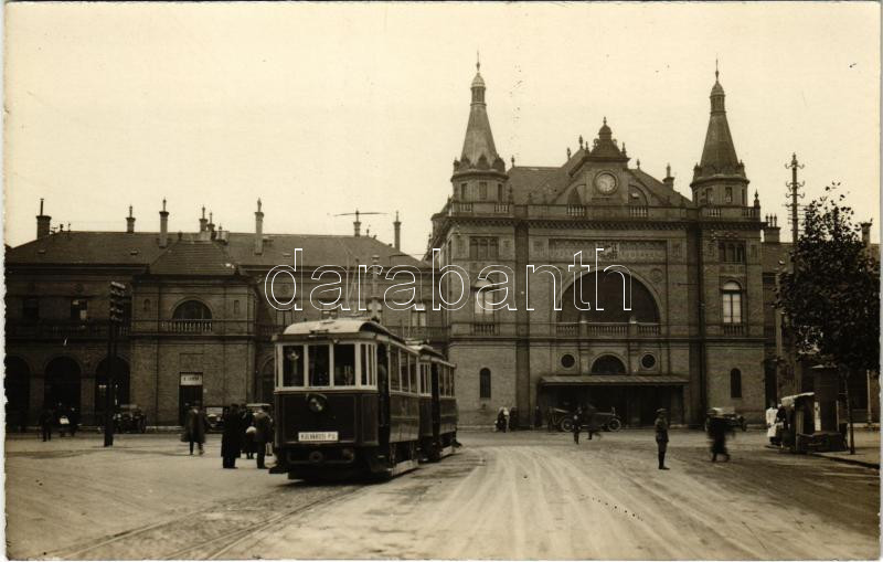 Leírás: Pécs, vasútállomás, főpályaudvar, Külvárosi P.U. villamos, autó, piacos utcai árus. Karl eredeti fénykép