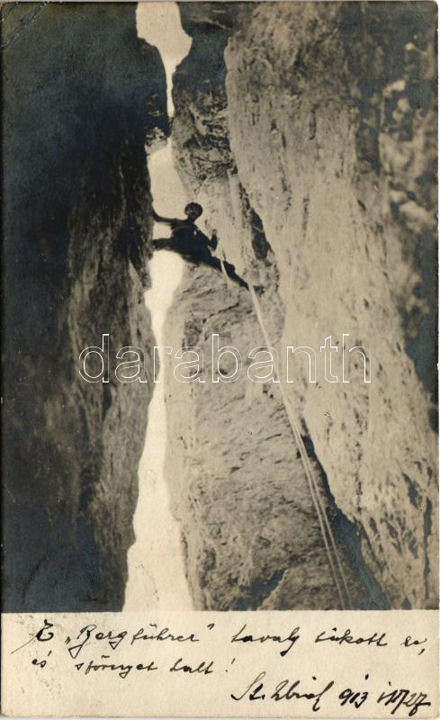 Leírás: 1913 Urtijei, St. Ulrich in Gröden (Südtirol); Dolomiten Delagothurm, Führer Adang / A Bergführer tavaly sikott le és szörnyet halt. photo (EK)
