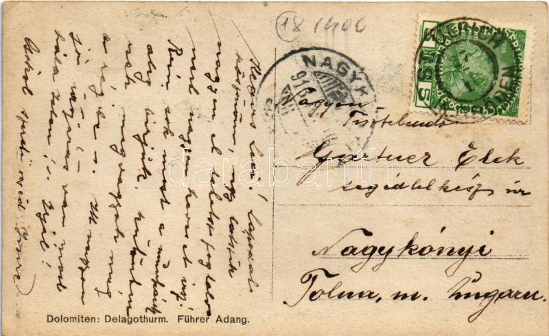 1913 Urtijei, St. Ulrich in Gröden (Südtirol); Dolomiten Delagothurm, ... https://www.darabanth.com/hu/428-Gyorsarveres/428.0/Kepeslapok/Olaszorszag~1500075/1913-Urtijei-St-Ulrich-in-Groden-Sudtirol-Dolomiten-Delagothurm-Fuhrer-Adang-A-Bergfuhre~II2745897