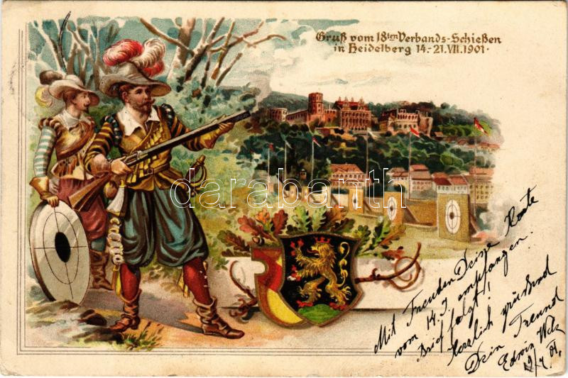 1901 Gruss vom 18ten Verbands-Schiessen in Heidelberg 14-21. VII. / Üdvözlet a 18. Német egyesületi lövöldözésről! Címeres szecessziós reklám / 18th German association shooting, Art Nouveau, coat of arms advertising litho (EK)