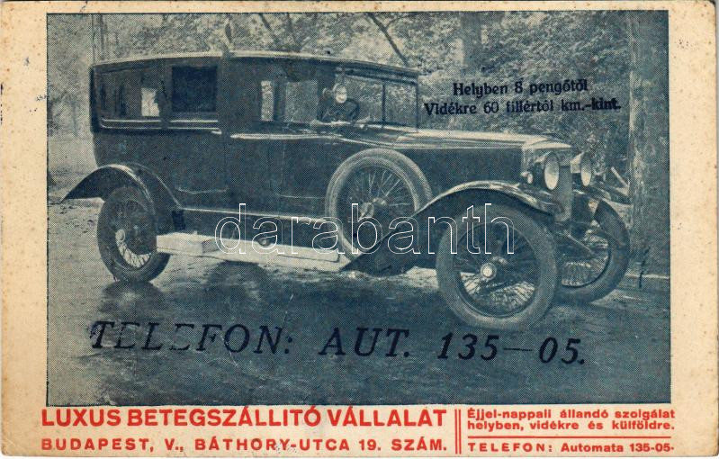 Luxus Betegszállító Vállalat autója, reklám. Budapest, Báthory utca 19... https://www.darabanth.com/hu/428-Gyorsarveres/428.0/Kepeslapok/Reklam~1500041/Luxus-Betegszallito-Vallalat-autoja-reklam-Budapest-Bathory-utca-19-Hungarian-Patient-T~II2744910