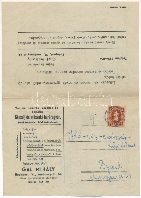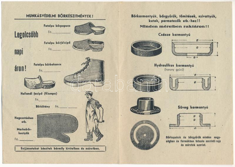 Munkásvédelmi bőrkészítmények! Bőrkarmantyúk, bőrgyűrűk, tömítések, szivattyúk, kutak, permetezők!! Minden méretben raktáron!! Gál Mihály gépszíj és műszaki bőráruműhely kinyitható reklám képeslapja. Budapest, Andrássy út 74.