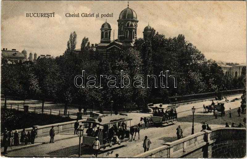 Leírás: 1910 Bucharest, Bukarest, Bucuresti, Bucuresci; Cheiul Garlei si podul / lóvasút / street view, horse-drawn tram (r)