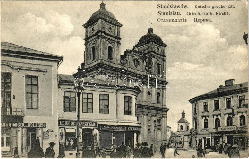 Leírás: 1915 Ivano-Frankivsk, Stanislawów, Stanislau; Katedra grecko-kat. / Griech.-kath. Kirche / Greek Catholic church, shops of Stanger & Wollisch, Leon Schwarzfeld + "K.u.K. Kpstelephonabt. No.6. (EK)