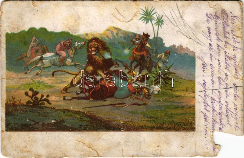 1902 Hunting art postcard, lion hunters. litho (b) https://www.darabanth.com/hu/428-Gyorsarveres/428.0/Kepeslapok/Vadasz~1500049/1902-Hunting-art-postcard-lion-hunters-litho-b~II2741099