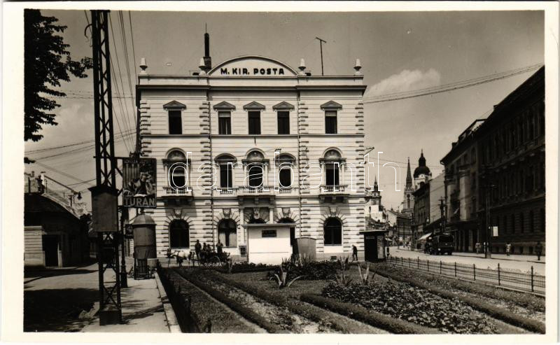 Újvidék, Novi Sad, Neusatz; M. kir. postapalota, Klippel József tejcsarnoka, dohányáruda, telefonfülke, Klein üzlete, Schuler József Turan reklám / post palace, advertising poster, telephone booth, shops, tobacco kiosk, milk hall