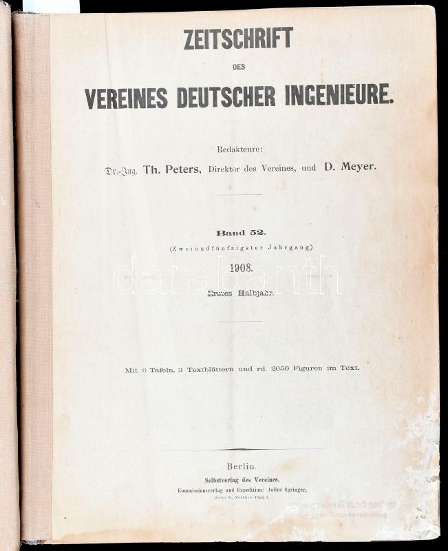 Zeitschrift des Vereines Deutscher Ingenieure. Redakteure (szerk.): Dr. Ing. Th. Peters, Direktor des Vereines, und D. Meyer. Band 52. 1908. Erstes Halbjahr. Berlin, 1908, Selbstverlag des Vereines, 1060 p. (A Német Mérnökök Szövetségének folyóirata, 1908. évi első fél évfolyam, egybekötve). Rengeteg szövegközi, fekete-fehér illusztrációval, illetve kihajtható táblával (műszaki rajzok, keresztmetszetek). Német nyelven. Korabeli, sérült félvászon-kötés, márványozott lapélekkel, a borítón és a gerincen sérülések, ázásnyomok, helyenként sérült, kissé foltos lapok. "Röck István és Első Brünni Gépgyár Részvénytársaság" bélyegzőkkel.