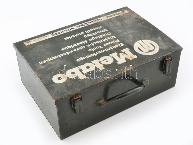 Leírás: Metabo retró német fém szerszámos láda, zárható, kopott, 37x25x14 cm