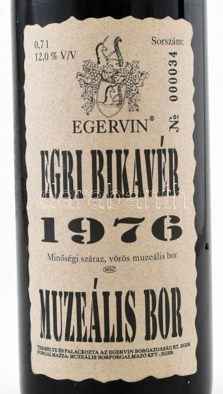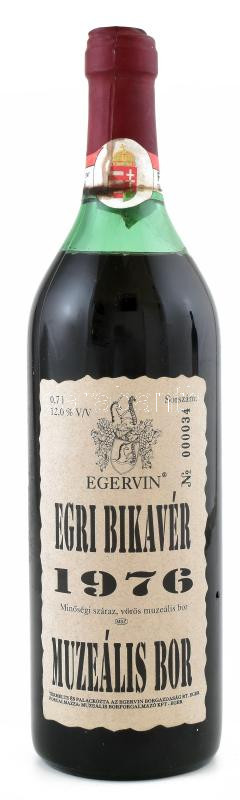 1976 Egervin Egri Bikavér 1976, Muzeális Bor, sorszámozott: 000034. számú palack bor, bontatlan palack száraz vörösbor, pincében szakszerűen tárolt, a palack fején a bor átütött, nedves, 12%, 0,75l.