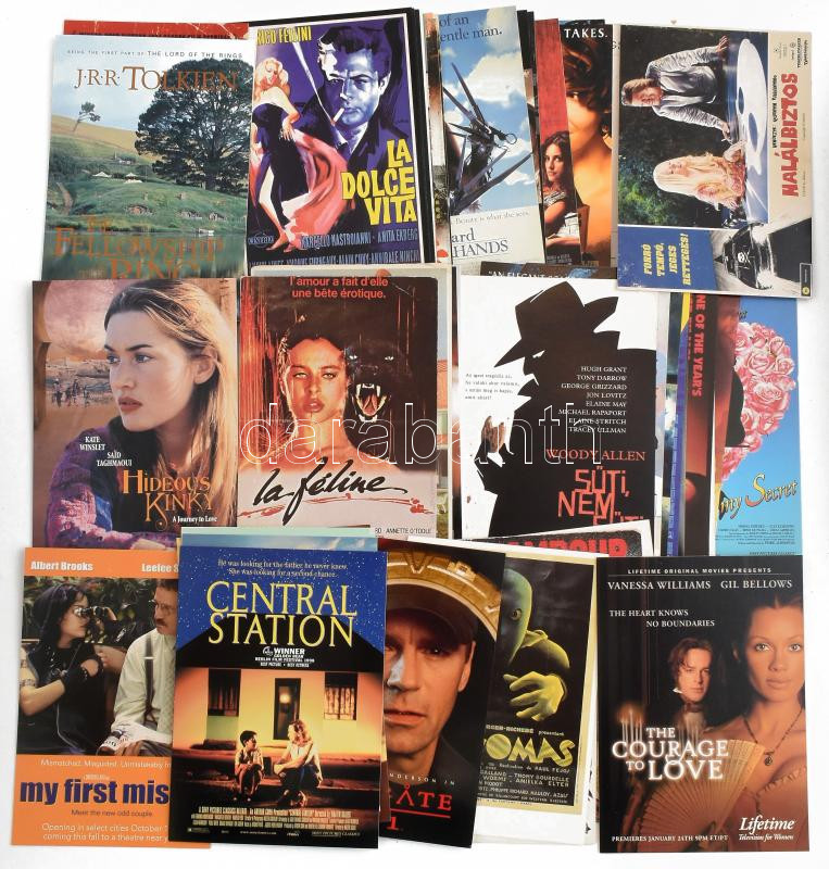 cca 1990-2000 Vegyes filmes képeslap, nyomtatvány tétel, kb. 50 db, közte: A Gyűrűk Ura I. A gyűrű szövetsége, Pulp Ficiton (Ponyvaregény), Trainspotting, Sleepy Hollow (Az Álmosvölgy legendája), Edward Scissorhands, Fear and Lost in Las Vegas (Félelem és Reszketés Las Vegasban),...stb