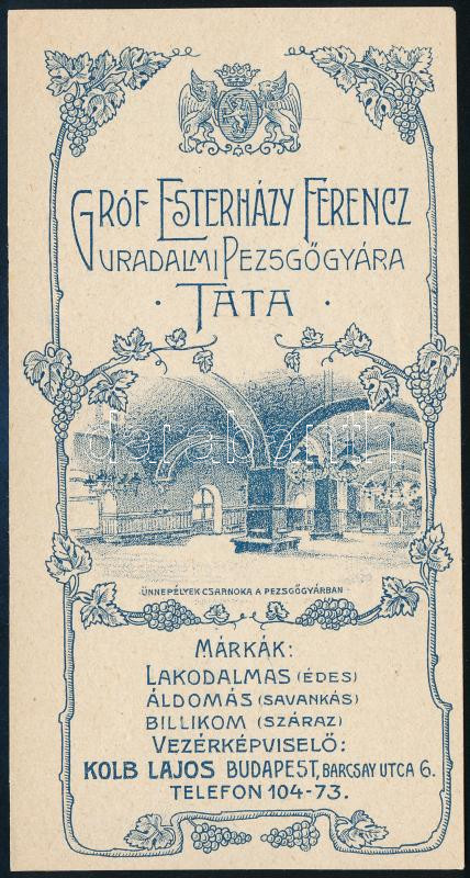 Gróf Esterháry Ferenc Uradalmi Pezsgőgyára Tata számolócédula https://www.darabanth.com/hu/428-Gyorsarveres/428.0/Mutargy-papirregiseg-egyeb/Reklam~500022/Grof-Esterhary-Ferenc-Uradalmi-Pezsgogyara-Tata-szamolocedula~II2742126