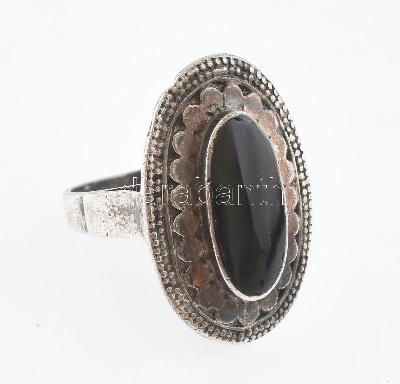 Leírás: Ezüst (Ag) gyűrű ovális fekete kővel, szélén apró sérüléssel, méret: 57, bruttó: 9 g