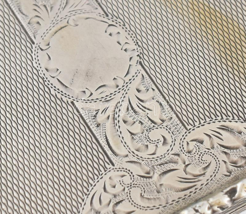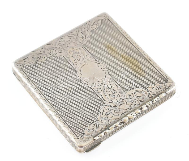 Leírás: Ezüst (Ag) régi púderkompakt, vésett díszítéssel, fazettált üveggel, nehezen csukódik, bruttó: 73,5 g, 6,5x6,5 cm