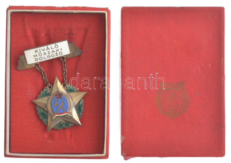 Leírás: ~1950. "Kiváló Műszaki Dolgozó" babérkoszorús, Rákosi-címeres, zománcozott bronz kitüntetés sérült tokban T:2 kis zománchiba