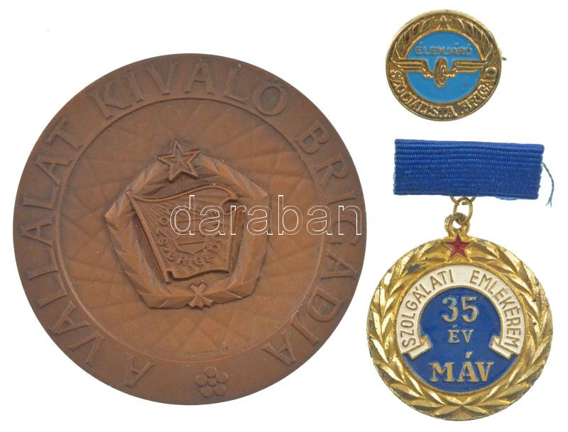 DN "Szolgálati Emlékérem - 35 év MÁV" aranyozott, zománcozott vasúti kitüntetés szalagon + "Élenjáró Szocialista Brigád" zománcozott fém vasutas jelvény + Vincze Dénes (1914-1972) DN "A Vállalat Kiváló Brigádja" bronz plakett (70mm) T:1-,2