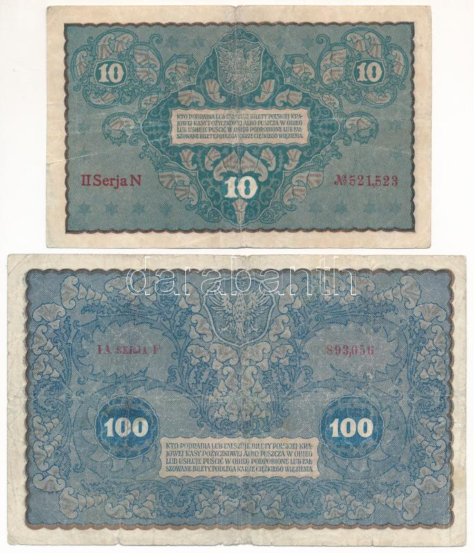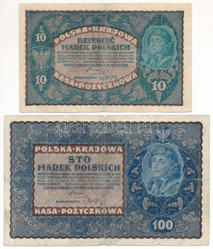 Poland 1919. 10 Marek + 100 Mare... https://www.darabanth.com/hu/428-Gyorsarveres/428.0/Numizmatika/Kulfoldi-bankjegyek~3000013/Lengyelorszag-1919-10M-plus-100M-TIII-Poland-1919-10-Marek-plus-100-Marek-CF~II2738049