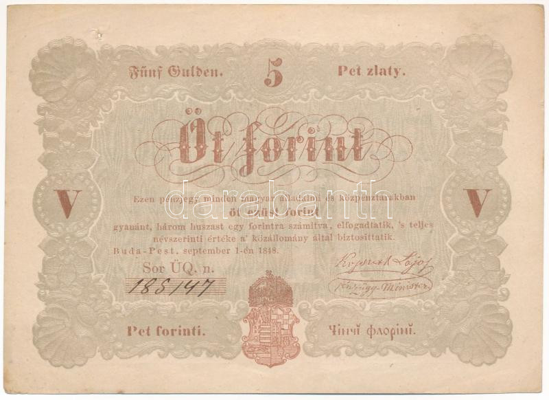 Leírás: 1848. 5Ft "Kossuth bankó" barna nyomat "ÜQ.n. 185147" T:I-,II kis ly. (tűnyom?)