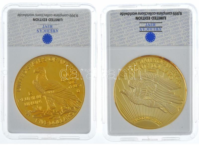 DN Amerikai Egyesült Államok 1929. 5 Dolláros érméjének nagyméretű "COPY" jelzéssel ellátott modern aranyozott Cu utánverete (40mm) + 1933. 20 Dolláros érméjének nagyméretű "COPY" jelzéssel ellátott modern aranyozott Cu utánverete (40mm) T:PP patina