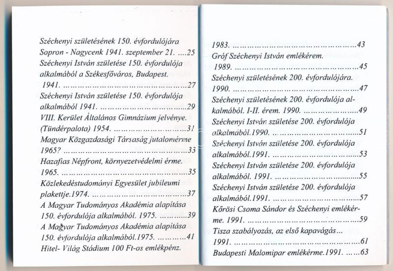 Egervölgyi Dezső: "Fémbezárt emlékezés - Széchenyi István munkássága érmeken". Pápa, 2010. Használt, nagyon jó állapotban, az első oldalon hibajavítós folt.