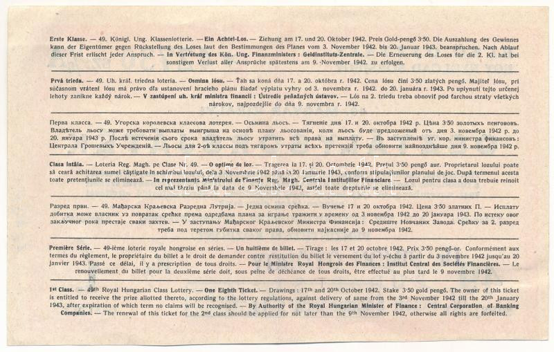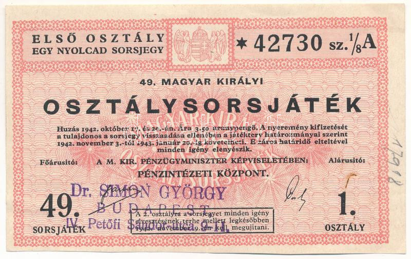 1943. "49. Magyar Királyi Osztálysorsjáték" első osztály egy nyolcad sorsjegye, "Dr. SIMON GYÖRGY BUDAPEST, IV. Petőfi Sándor-utca 9-11." bélyegzéssel T:II,II-