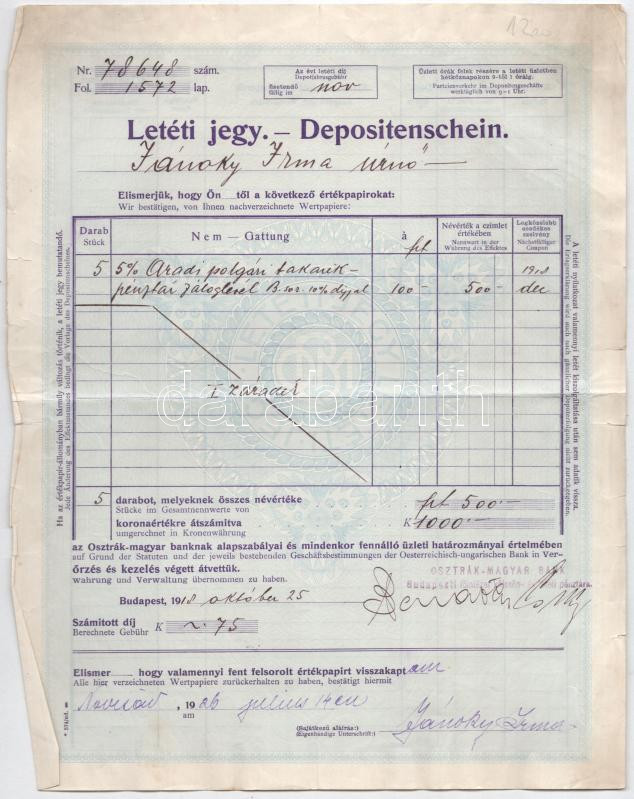 Budapest 1918-1926. "Osztrák-magyar bank" kitöltött letéti j... https://www.darabanth.com/hu/428-Gyorsarveres/428.0/Numizmatika/Reszvenyek-es-sorsjegyek~3000005/Budapest-1918-1926-Osztrak-magyar-bank-kitoltott-leteti-jegye-TIII-szakadasok-kis-ceruzas~II2742685